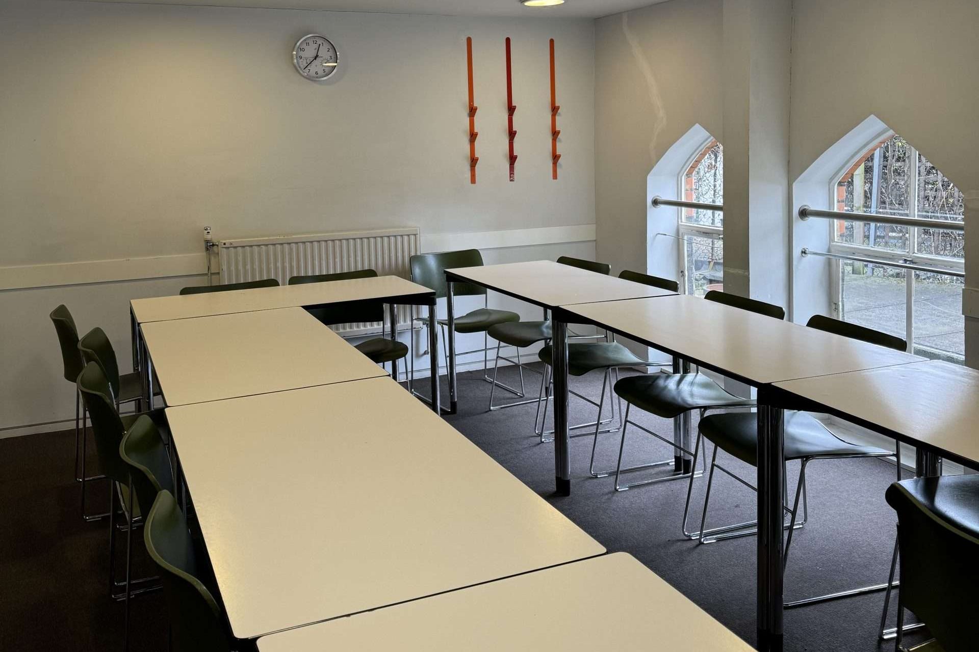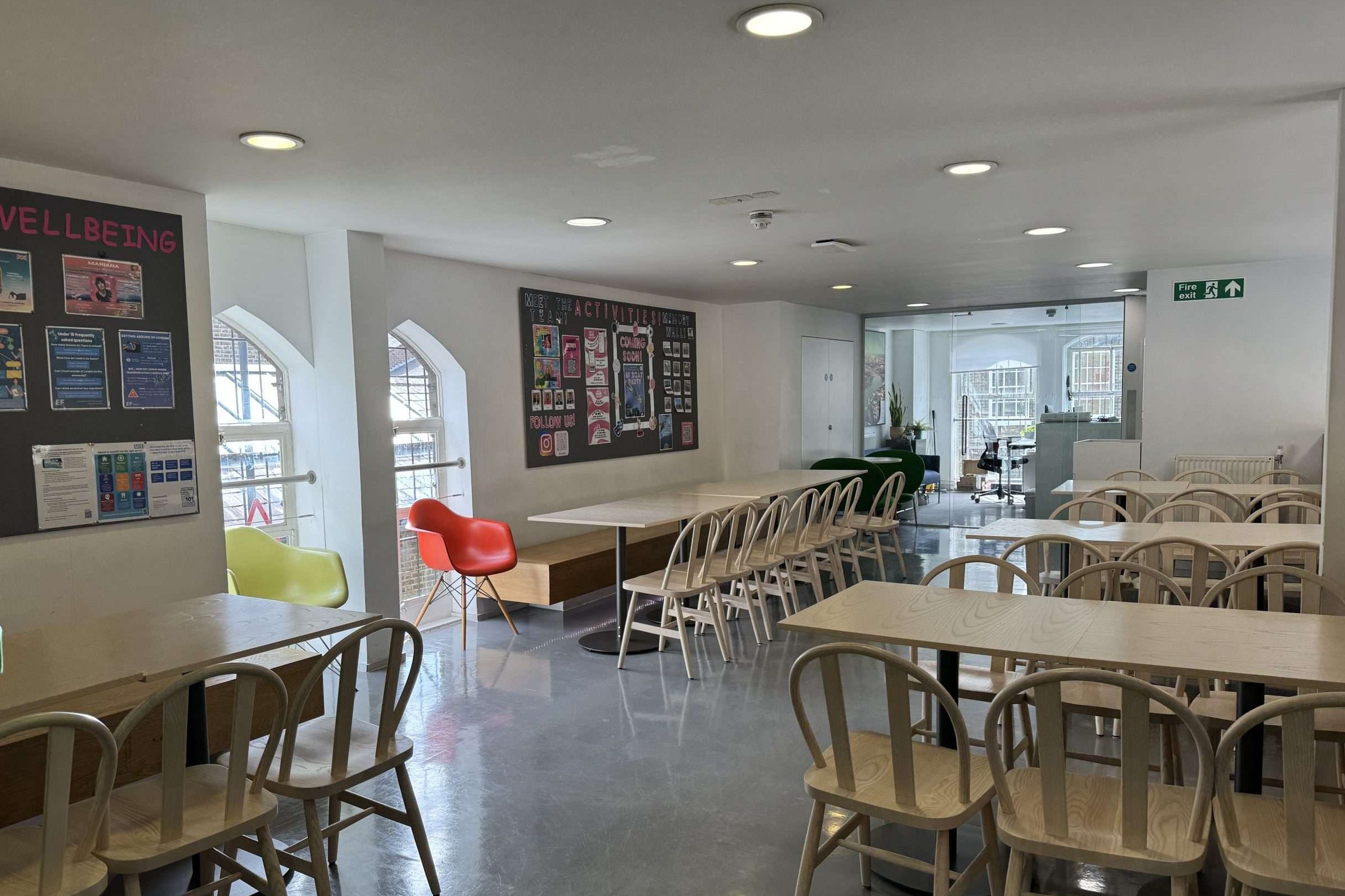 There are numerous communal areas away from the classrooms, meaning there are no noise restrictions within those areas. These communal areas include a cafeteria serving in-house food, a games room (which they are updating this summer), a library with several PCs, and study areas on different floors.