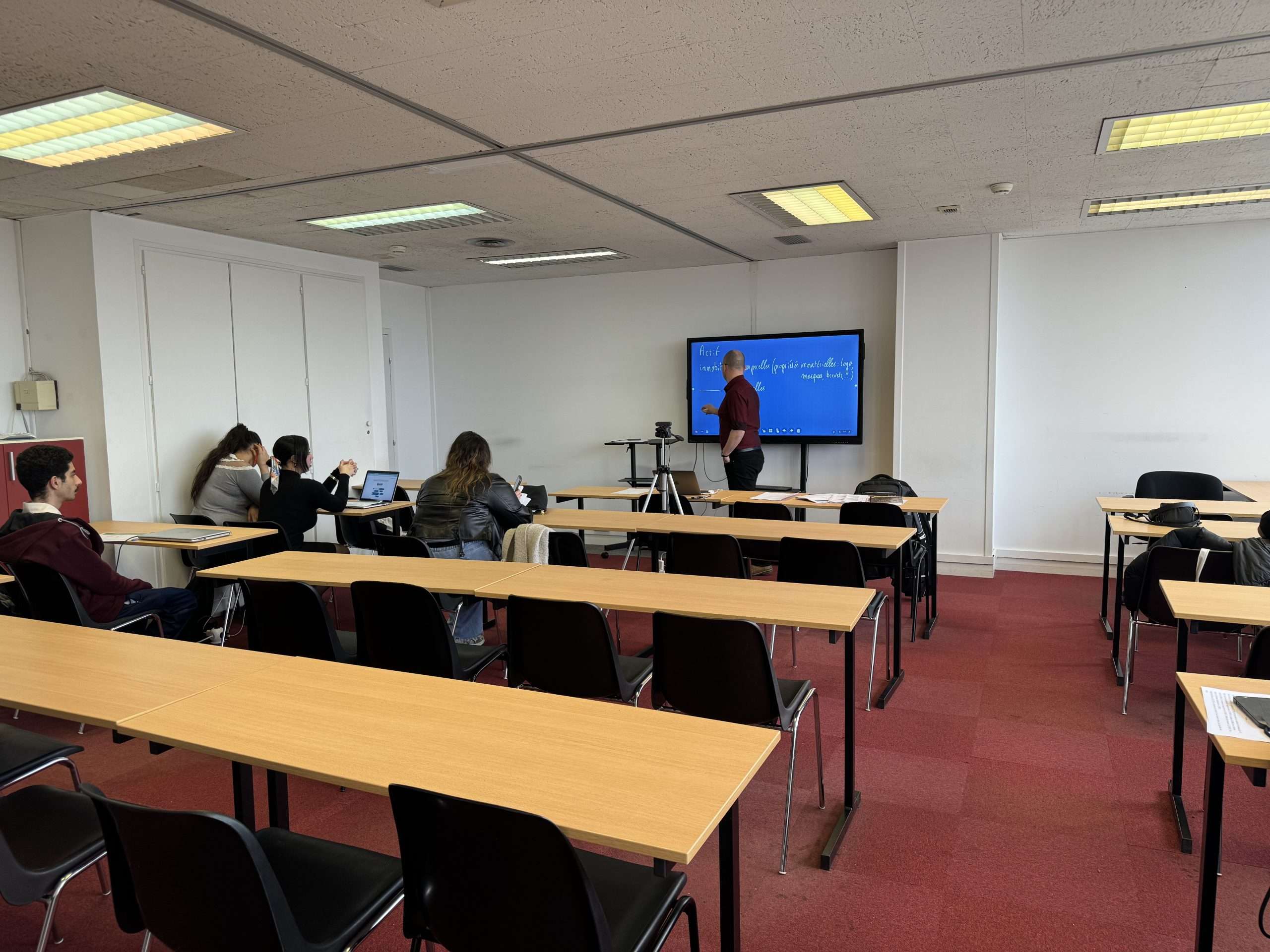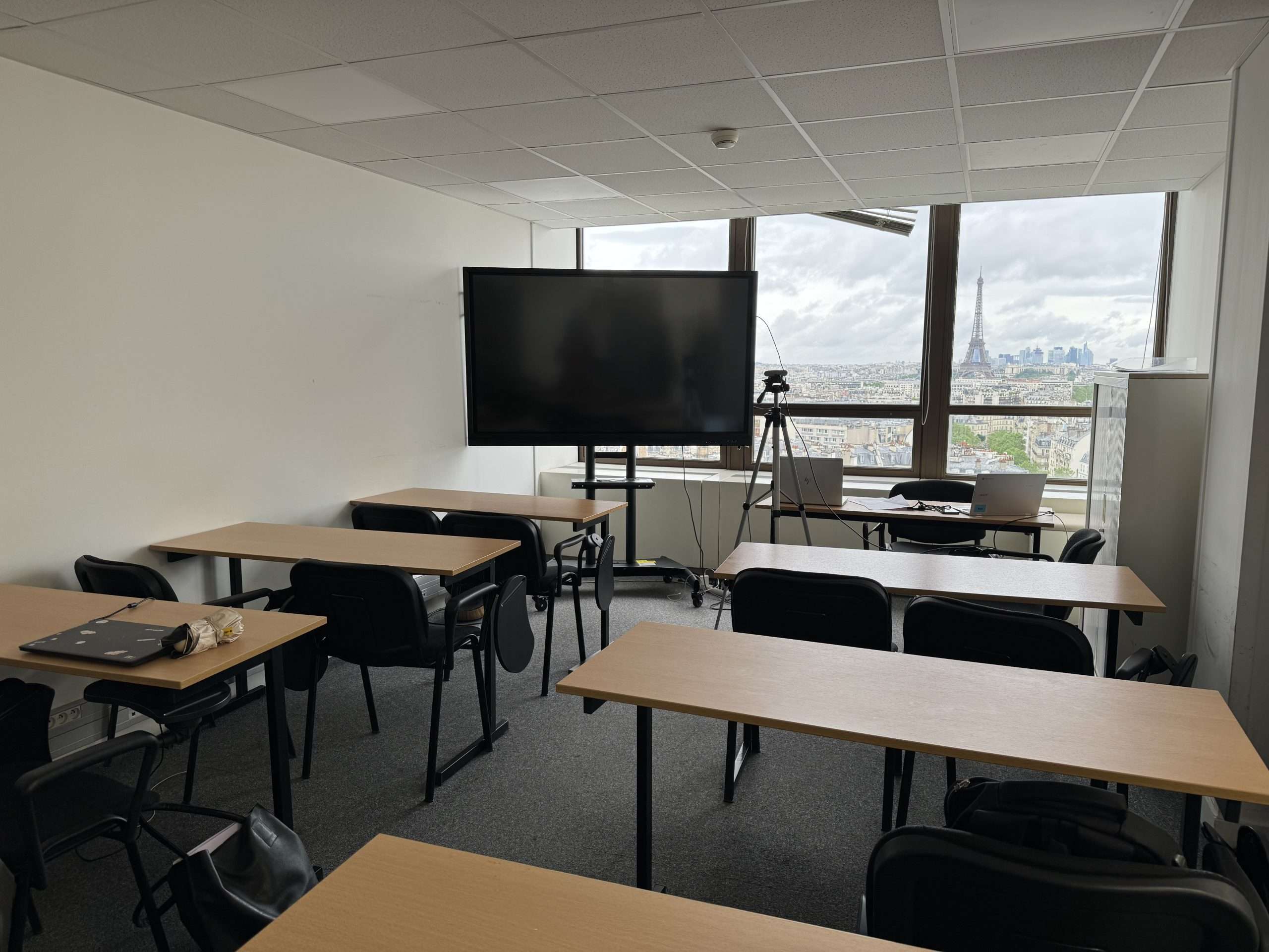 Large or extremely large classrooms with full sized tables and mostly padded chairs. Also many of the classrooms (at least 50%) have a view of the landscape of Paris, including the Tour Eiffel! Also they’re technologically modern with interactive whiteboards in all the classrooms. They have great amenities with air-conditioning, heating and windows in all of their classrooms.